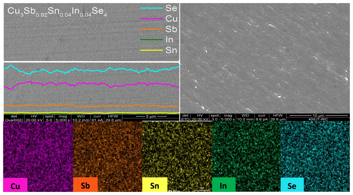 Figure 2 presents the BSE–SEM images of Cu3Sb0.92Sn0.04In0.04Se4 (upper left: polished surface and upper right: fractured surface) with elemental