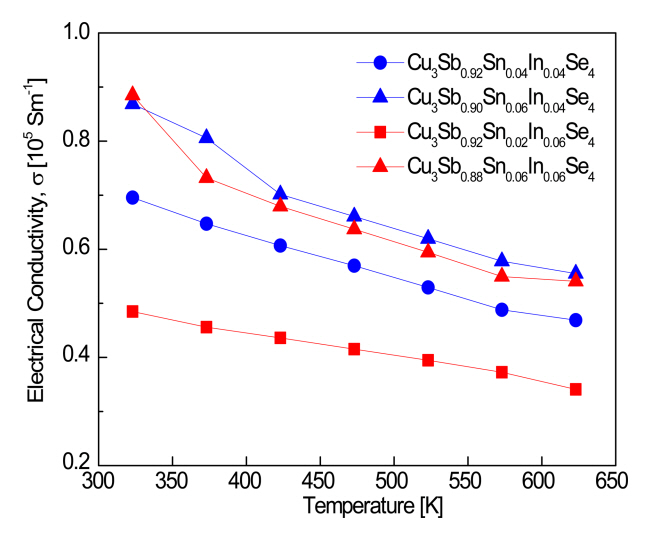 conductivity increases and the Sn doping effect becomes dominant. When Sn4+ and In3+ are substituted at the Sb5+ sites of Cu3SbSe4, additional charge carriers (holes) are created, resulting in increased electrical