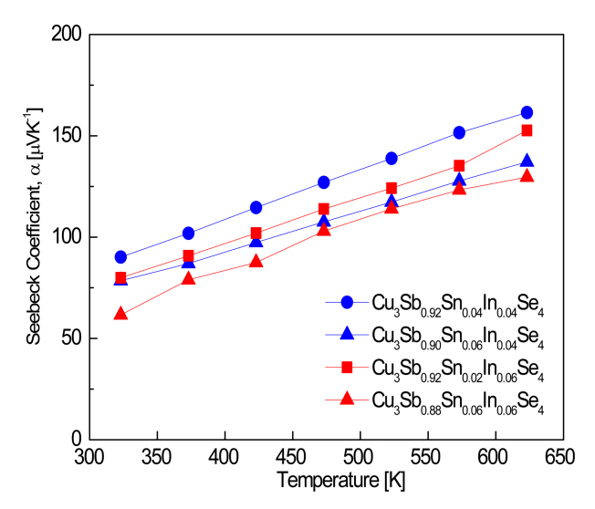 Figure 4 shows the Seebeck coefficients of Cu3Sb1−x−ySnxInySe4. All specimens exhibited positive values in the measured temperature range, which
