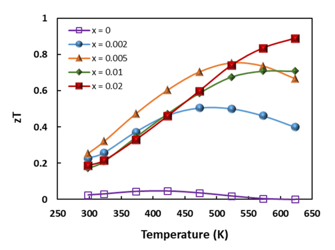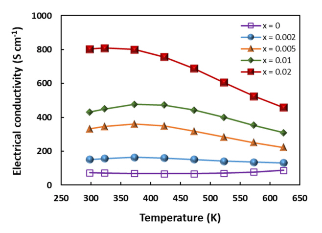 볼 수 있다. 파워팩터의 최대값은 x = 0.02인 샘플에서 얻어졌으며, 523 – 573 K 구간에서 약 1.8 mW m-1K-2였다.