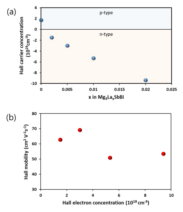 그림 3은 PPMS를 이용하여 측정한 298 K에서의 전하 농도 및 전하이동도를 표시한 그래프이다. La으로 도핑되지 않은 Mg3LaxSbBi 소결체는 p형 극성을 보였으며, 홀농도는 약 1.7 × 1019 cm-3 이었다. La이 도핑되면서 n형으로 극성이 전환되었고, 그후 La 함량 x에 대하여 전자농도가 거의 선형적으로 증가하였다. 전자농도의 최대값은 x = 0.02에서 9.4 × 1019 cm-3 로 측정되었으며, La 함량을 더 증가시킬 경우 1 × 1020 cm-3 이상의 전자농도를 충분히 얻을 것으로 판단된다. 여기서 La을 사용하여 Mg3Sb2-xBix를 n형으로 도핑한 기존의 문헌들을 살펴보면, Imasato 등은 Mg3La0.03Sb1.5Bi0.5에 대하여 ~6.5 × 1019 cm-3 의 최대 도핑농도를 보고하였고, 전자농도와 La 첨가량은 선형적인 비례관계를 보이지 않고 포화되는 경향을 보였다[17]. 반면 Zhang 등은 Mg3La0.02Sb1.5Bi0.5에서 9.4 × 1019 cm-3 의 전자농도를 보고하였고, La 첨가량과 전자농도는 거의 직선적으로 비례하였다[29]. 따라서 본 연구에서 확인된 실험결과는 Zhang 등의 보고와 유사한 경향을 보이고 있다. Mg3Sb1.5Bi0.5의 열전특성 극대화를 위한 최적 도핑농도 범위가 (2-5) × 1019 cm-3 범위라고 알려진 것을 고려할 때[17,31], LaSb를 n형 도핑에 사용하는 방법은 Sb/Bi 혼합 비율 및 사용온도에 따라 가변되는 Mg3Sb2-xBix 소재의 최적 도핑농도를 안정적으로 만족시킬 수 있다고 판단된다.