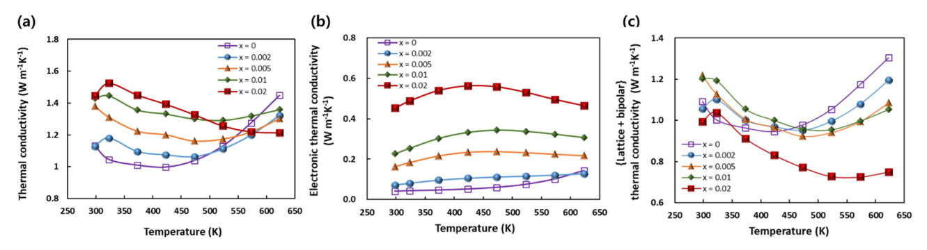 carrier의 농도를 증가시키는 방법을 사용하게 되는데[36], 그림 6 (c)에서는 La 함량을 증가시켜 majority carrier 인 전자의 농도를 증가시킴에 따라 ~500 K 이상에서의 열전도도가 감소하는 경향을 보이고