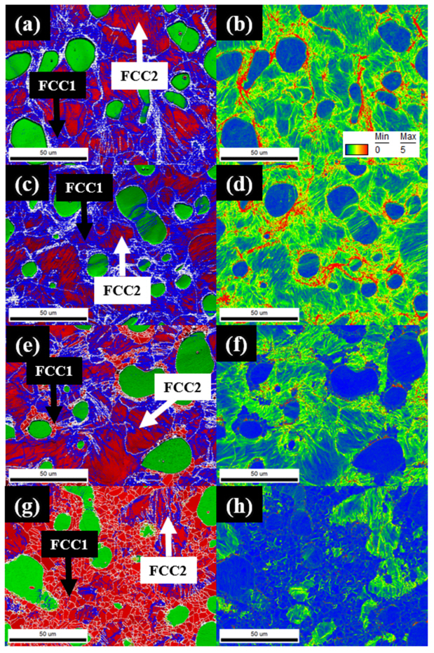 갖는 것을 볼 수 있고, FCC2는 여전히 낮은KAM값을 유지하는 것을 확인할 수 있다. Fig 5 (g)-(h) 와 같이 열처리 온도가 900°C까지 증가하면 대부분의 FCC1이 재결정되고 FCC2에 낮은 KAM값을 유지하는 점으로 미루어 볼 때, FCC2에서는