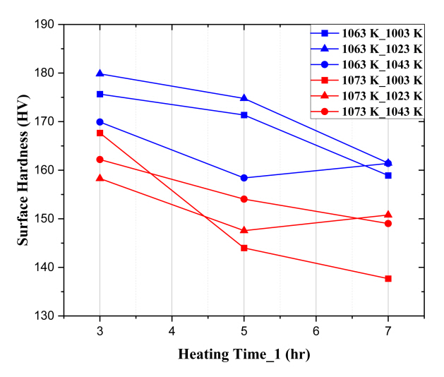 the spheroidization heat treatment conditions, changing the 1st heating temperature and time rather than the 2nd heating temperature can lead to more changes in the surface hardness.