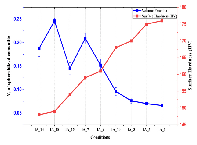 between the spheroidized volume fraction of the steel and the surface hardness value.