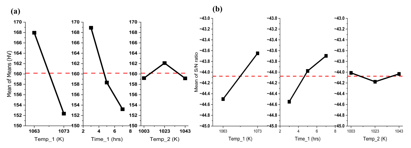 Fig 9 (a) is a graph of the data in Table 5. In Fig 9, the red dotted line is the average surface hardness value of all 18 conditions.