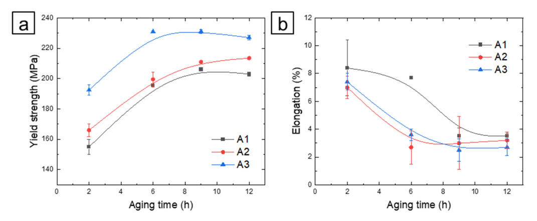 (a) Yield strength and (b) elongation changes during T5 treatment of A1, A2 and A3