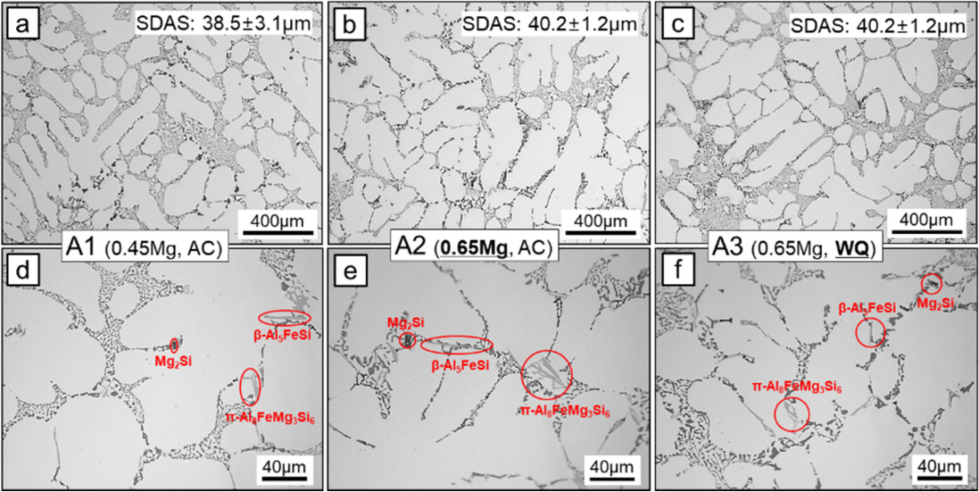 ํ๊ธฐ ์ํด ๊ดํํ๋ฏธ๊ฒฝ์ ์ด์ฉํ์ฌ ๊ฐ ํฉ๊ธ์ ์ฃผ์กฐ ์ํ ๋ฏธ์ธ์กฐ์ง์ ๊ด์ฐฐํ์๋ค (๊ทธ๋ฆผ 2). Mgํจ๋๊ณผ ๋๊ฐ์๋ ์ฐจ์ด์ ์๊ด์์ด ์ธ ํฉ๊ธ ๋ชจ๋ ฮฑ-Al ์์ง์ ์กฐ์ง๊ณผ ๊ณต์ Si, ๊ทธ๋ฆฌ๊ณ Mg2Si, ฮฒ-Al5FeSi, ะฟ-Al8FeMg3Si6 ์ด ๊ด์ฐฐ๋์๋๋ฐ, ํ์ฑ๋๋ ์ ์ถ์ ์ข