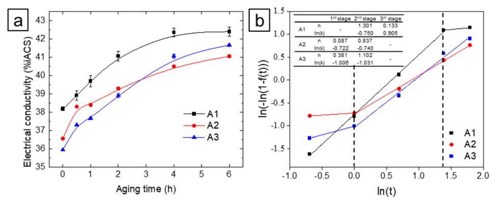 (a) Electrical conductivity and (b) Avrami plots for transformed precipitate fractions