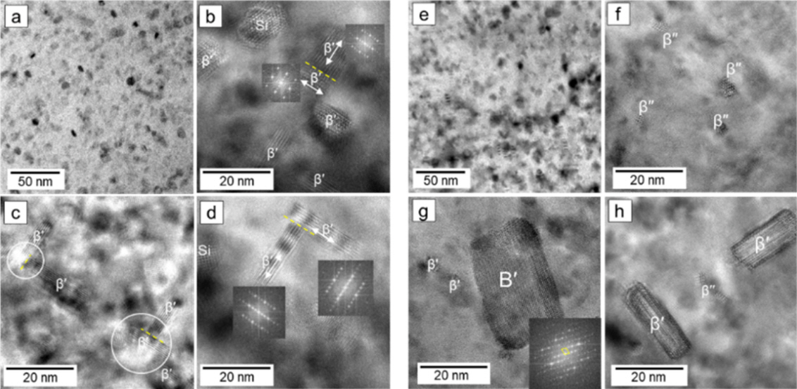 BF and HRTEM images of (a-d) A1 and (e-h) A2 alloys aged at 190 ยฐC during 12 h