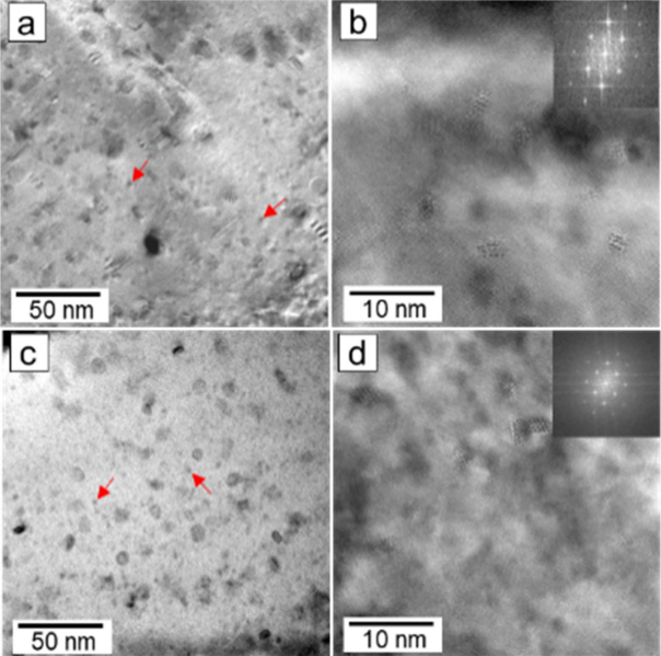 BF and HRTEM images of (a,b) A2 and (c,d) A3 alloys aged at 190 ยฐC during 2 h. Red