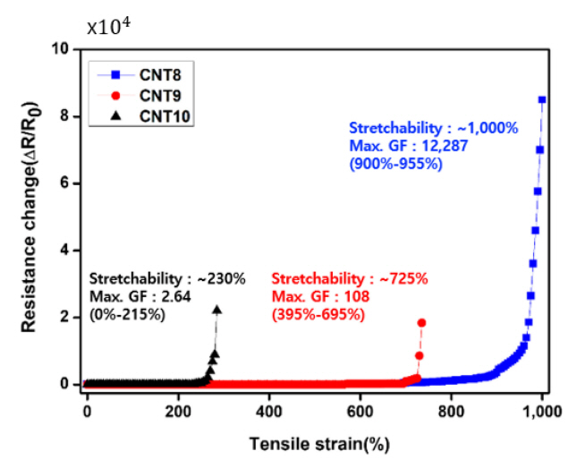 한편 Ecoflex 레진의 양이 증가할수록 센서의 감도 즉 gauge factor(GF)는 증가하였다. GF는 (∆R/R)/ε의 값으로 정의되며, 인장변형율(ε) 대비 저항 변화율(ΔR/R)이 클수록 높은 GF 값을 갖는다. CNT10, CNT9 및 CNT8 샘플의 최대 GF는 각각 2.6, 108 및 12,287 이었다. 즉 Ecoflex