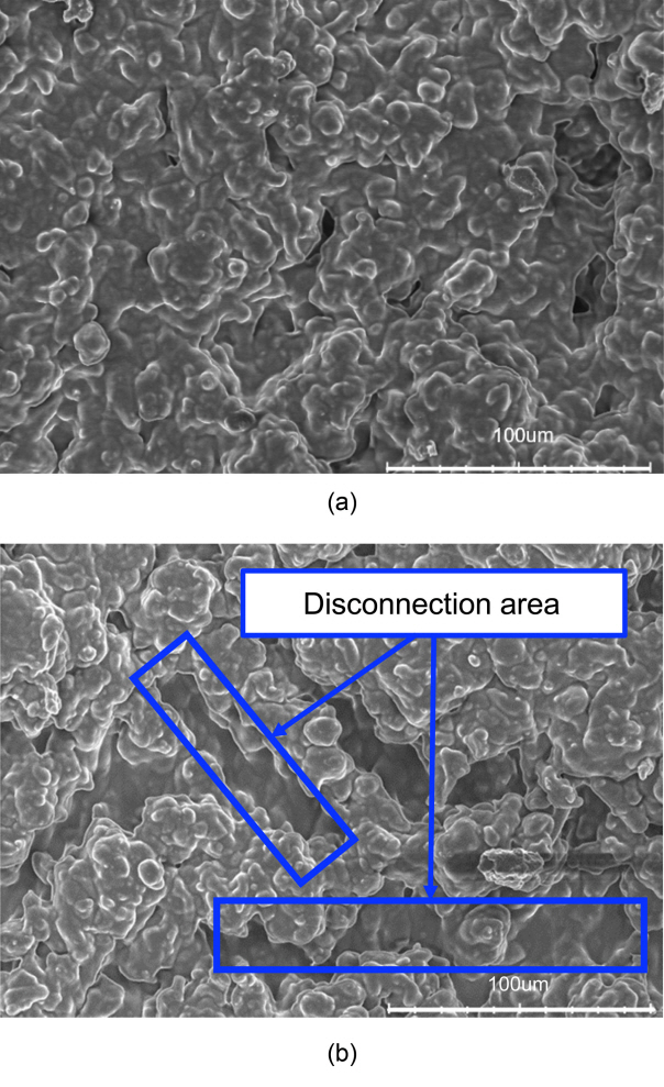 알 수 있었다. 그러나 단락이 발생하였음에도 불구하고 전체적으로 CNT와 바인더의 전기적 네트워크 구조가 잘 유지됨을 알 수 있었다.