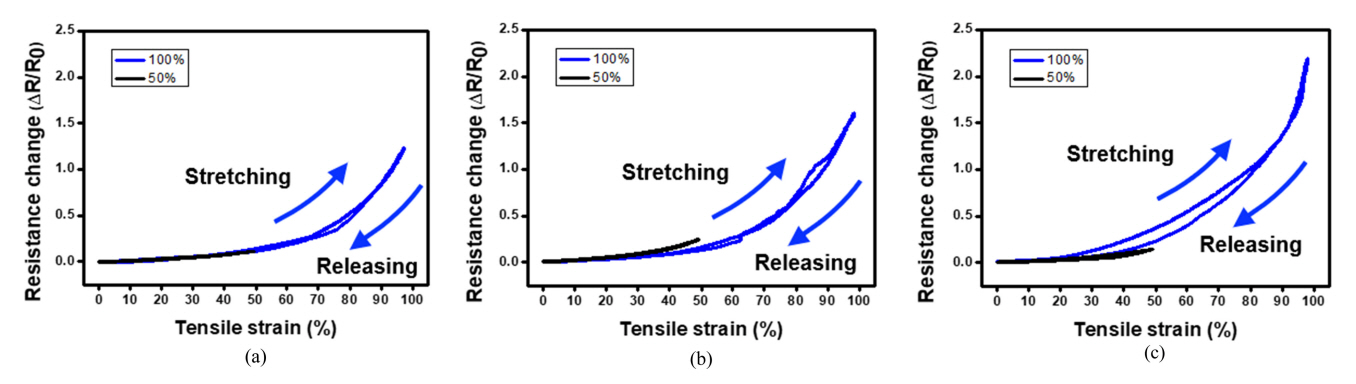 그림 4는 3 종류의 신축성 스트레인 센서에 대하여 인장 시험을 수행했을 경우에, 인장 시 발생한 센서의 저항 변화를 나타내고 있다. 센서의 저항의 변화는