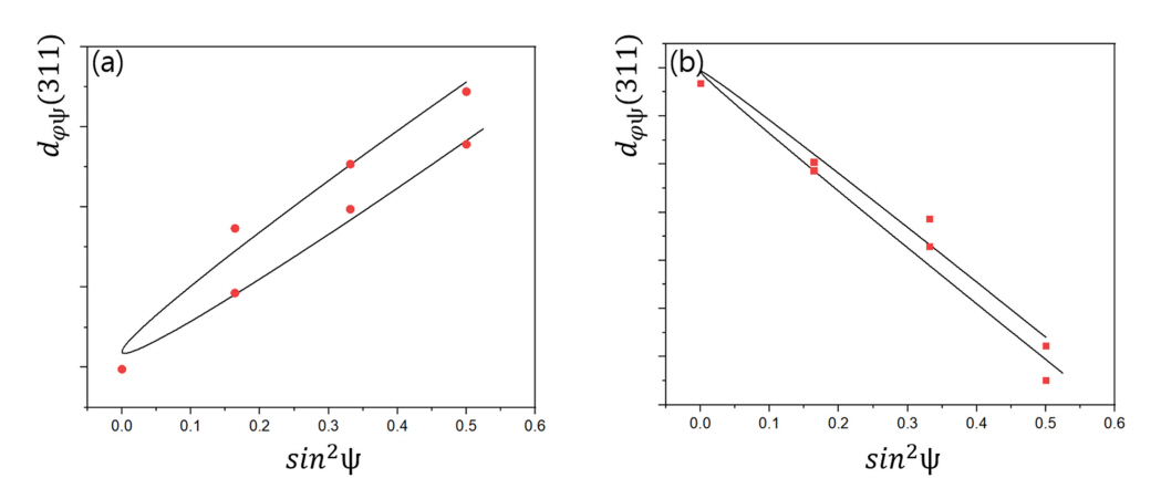 Plot of (311) vs.sin2 ψ for A356.2: (a) as-built, (b) 480°C-6h heat treated sample.