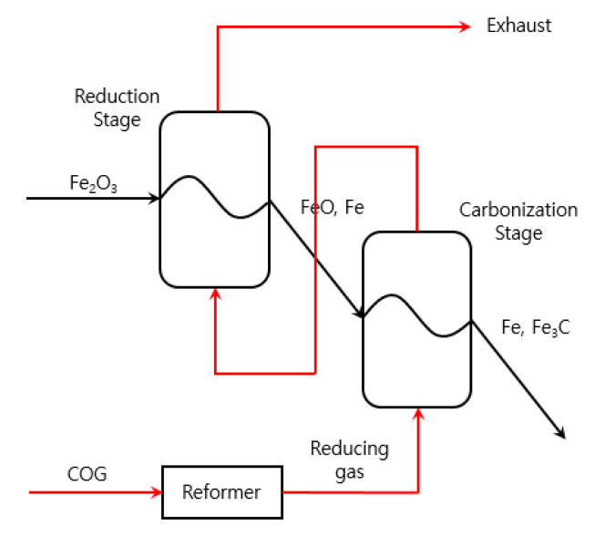 reduction using reformed COG, as proposed in Figure 1 [11]. The system is composed of two stages (reduction and carbonization), where COG and
