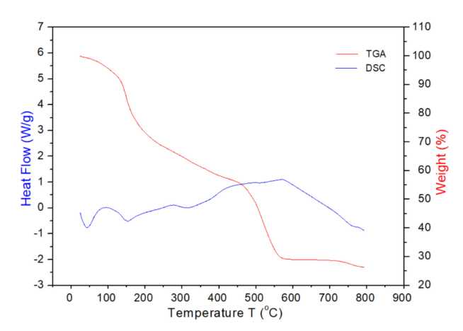 중량이 감소하는 곡선을 나타낸다. 이후에는 약 300°C 부근에서 약하게 발열피크 (exothermic peak)가 나타나는데, 이는 유기물등의 분해로