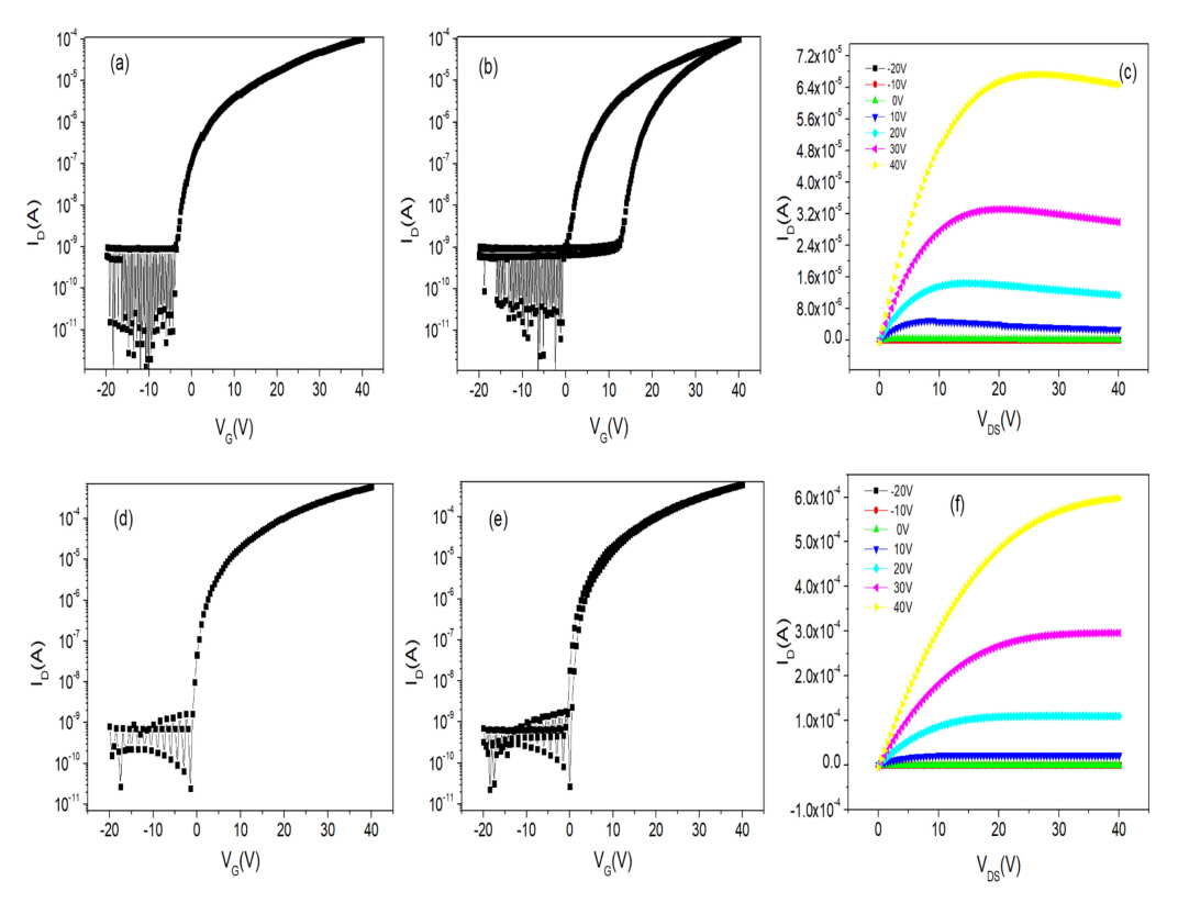 Output curve의 특성을 그림 5c와 5f에서 살펴보면, 우수한 contact특성과 공고한 포화 (saturation)특성이 잘 나타난다. 이는 PGMEA의 첨가한 경우에도 동일하게 우수한