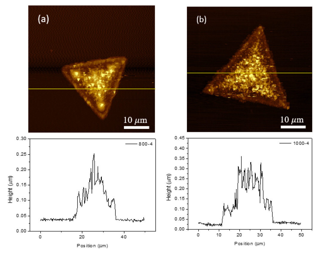The triangular crystals and the thickness are clearly demonstrated in AFM measurements,