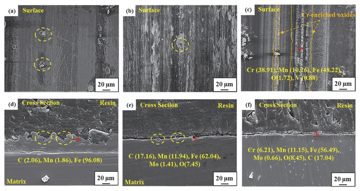 (b,e) 18Mn, and (c,f) 18Mn-Cr.