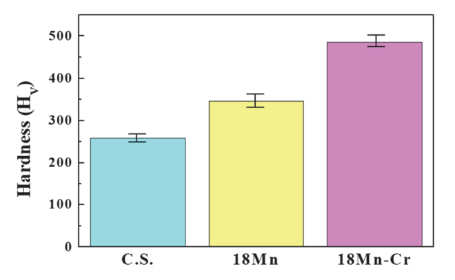 그림 4는 각 시편의 비커스 경도의 평균값을 나타내었으며, C.S. (257 HV), 18Mn (346 HV), 18Mn-Cr (485 HV) 순서로 경도