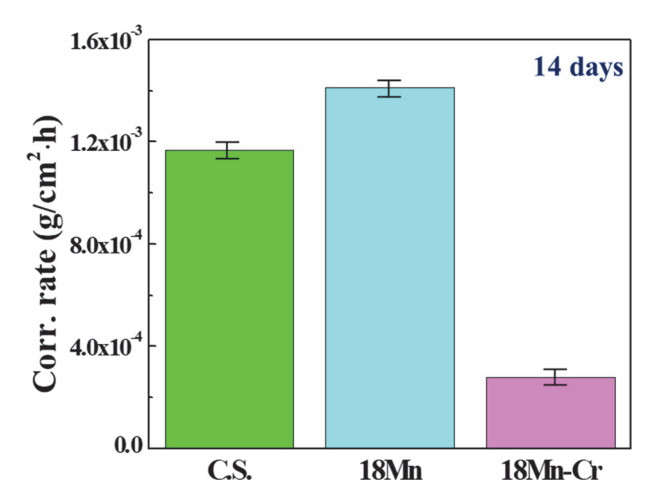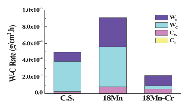 그림 6는 부식 환경 내 침지 후 측정된 부식속도 결과를 나타낸다. 본 연구에서 정의 하고 있는 순 부식량 (C0) 값의 경우와 동일하게 18Mn > C.S. > 18Mn-Cr 순서로 높게 측정되었는데 이는 앞서 수행된 전기화학실험 결과 (LPR 및 EIS)와