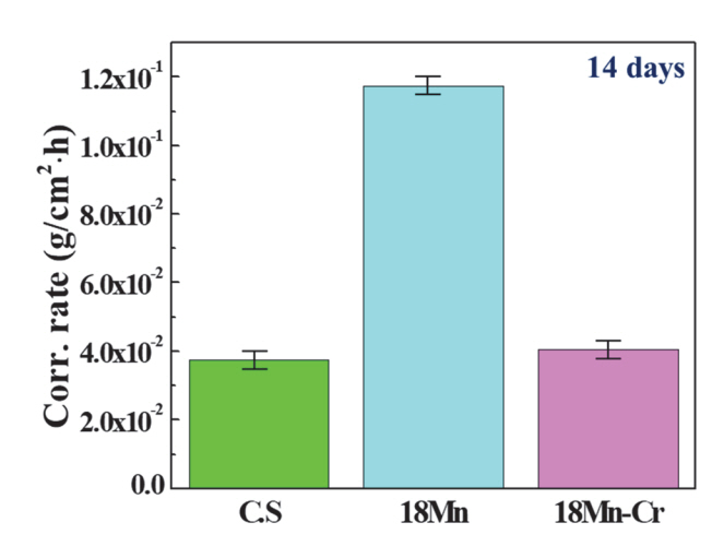 et al. [17]의 선행연구에 따르면 고Mn강 내 첨가되는 미량의 Cr은 부식환경 내 노출 시 Fe 기반 부식생성물 내 Cr이 일부 치환되어 생성물 입자의 수축에