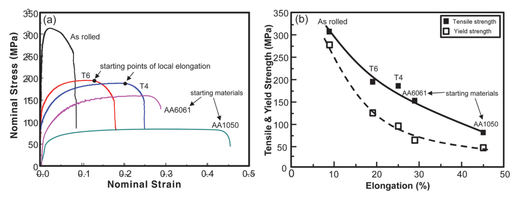 Fig 7 shows nominal stress-nominal strain(s-s) curves (Fig 7a) and the mechanical properties (Fig 7b) of the asrolled and the age-treated materials for the 2-layer stack CRB. The starting