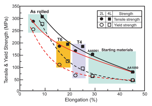 The strength of the roll-bonded material was greatly increased to 280 MPa and the