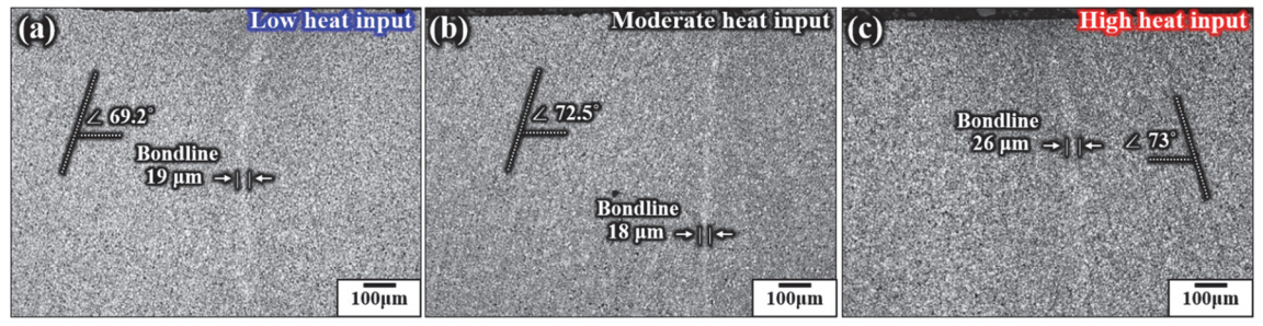 OM images of ERW seam welds showing the width of bondline and metal flow angle depending