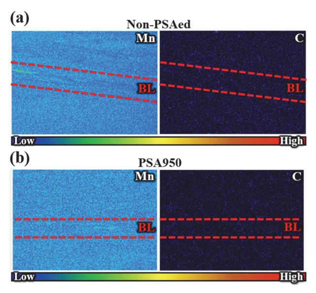 Results of EPMA analysis showing Mn and C distribution near bondlines of (a) non-PSAed