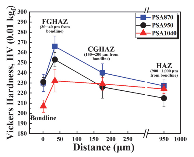 ERW ๊ฐ๊ด์ PSA ์จ๋์ ๋ฐ๋ฅธ ์ฉ์ ๋ถ์ ๊ฒฝ๋ ๋ถํฌ๋ฅผ ํ์ธํ๊ธฐ ์ํด ๋น์ปค์ค ๊ฒฝ๋๊ณ(Vickers hardness meter: Mitutoyo็คพ,