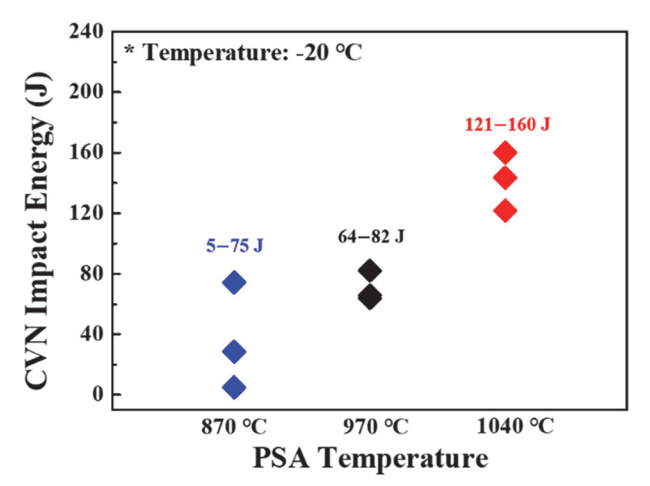 Results of CVN impact tests at โ20 ยฐC of ERW bondline subjected to different PSA temperatures