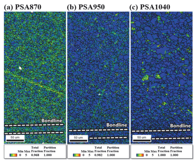 EBSD-Grain size maps showing grain size distribution near the bondline subjected to