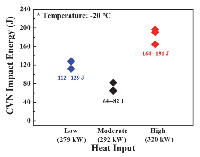 Results of CVN impact tests at โ20 ยฐC for ERW bondline with different heat inputs