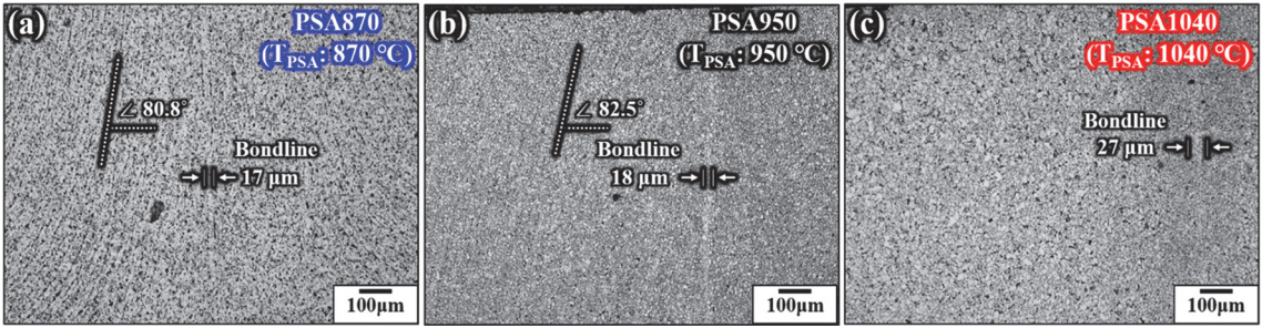PSA ์จ๋๋ 950 ยฐC๋ก ๋์ผํ๊ฒ ์ ์ฉํ์๋ค. OM์ ํตํด ๊ด์ฐฐํ ๊ฒฐ๊ณผ(๊ทธ๋ฆผ 1), ์กฐ๊ด ์ ๋ฉํ ํ๋ก์ฐ(metal flow) ๊ฐ๋๋ ๋ชจ๋ 69.2โ73o ์์ค์ผ๋ก ์ ์ฌํ๊ฒ ๋ํ๋ฌ๋ค. ๋ฉํ ํ๋ก์ฐ ๊ฐ๋๋ ๋์ผํ ์