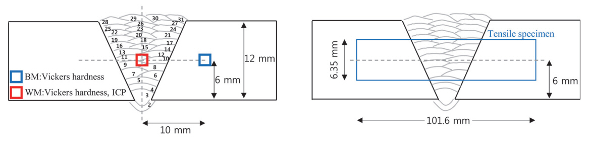 유지 후 공냉하였다. 용접 조인트의 화학 조성, 비커스 경도 측정 및 인장 시험편의 가공 위치는 Fig 1의 모식도에 나타내었다. 용가재 및 선택된 위치에서 채취된 WM의 화학 조성은 유도결합플라즈마-질량분석기 (Thermo Fisher Scientific,