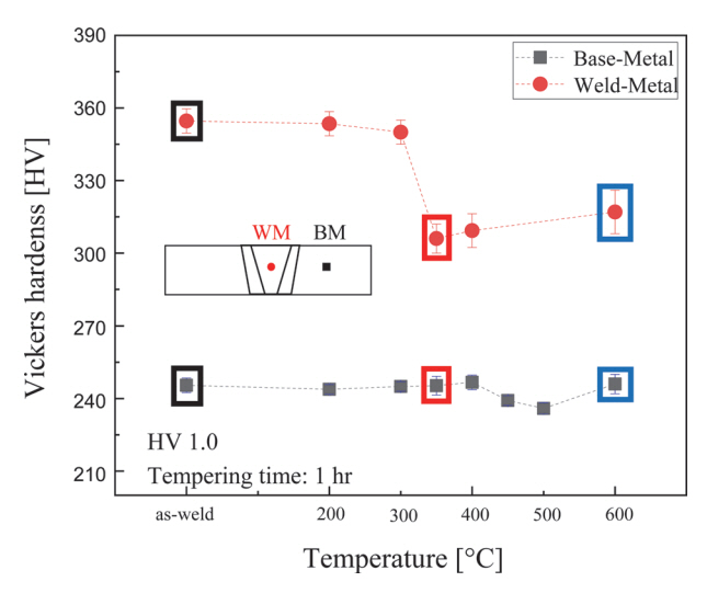 용접 후 열처리 온도 선정을 위해, 200~600 °C에서 열처리된 용접 조인트의 비커스 경도를 시험편의 BM과 WM의 위치에 따라 비교하였다 (Fig 3). As-weld의 BM은 246 HV, WM은 355 HV의 경도를 가진다. BM의 경도는 용접 후 열처리 온도가 400 °C에 이를 때까지 약