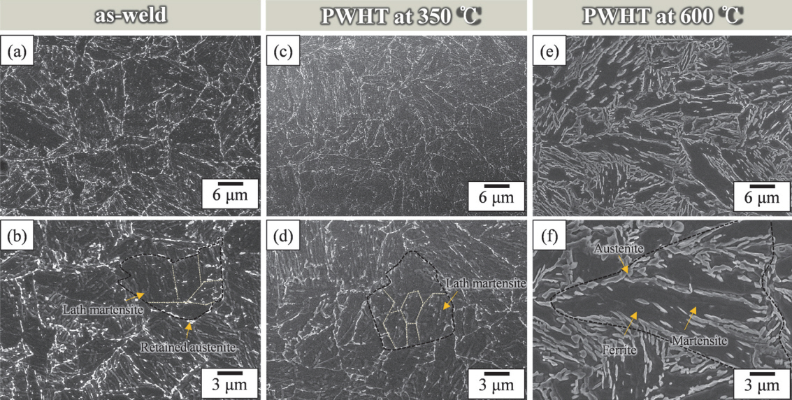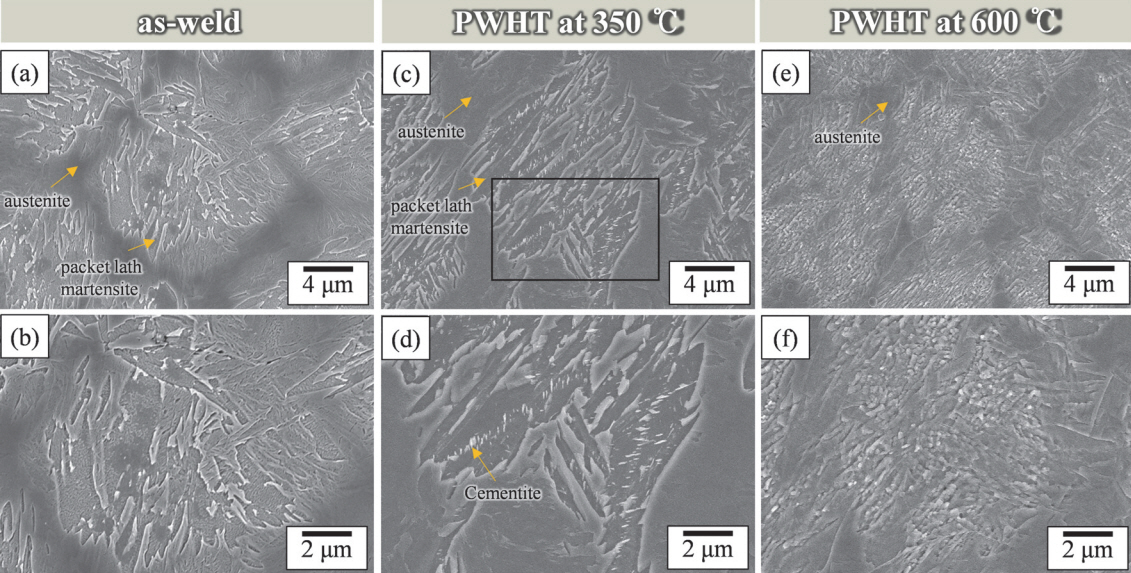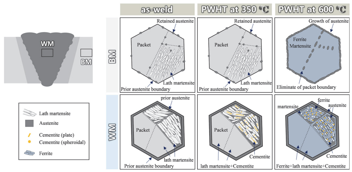 하지만, BM과 WM은 마르텐사이트 기지조직을 페라이트, 오스테나이트, 시멘타이트 그리고 부분적인 마르텐사이트로 상변태 할 수 있어, BM과 WM에