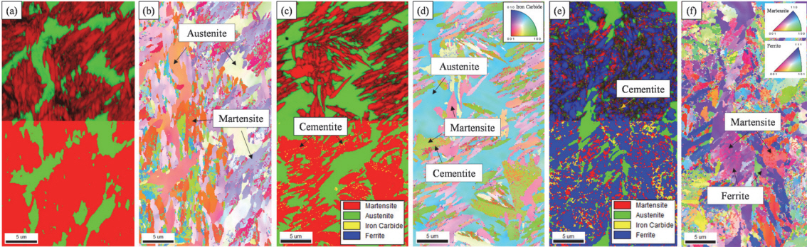 결정립의 크기 차이가 존재하며, EBSD 위상 맵 분석에서 마르텐사이트 (BCT)와 페라이트 (BCC)의 구분이 보고된다[27]. Fig 7 (f)에서 기지 조직페라이트와 부분적으로 형성된 미세한 마르텐사이트의 결정 크기와 방위가 구분되어 위상 맵에서 구분하여 분석하였다.