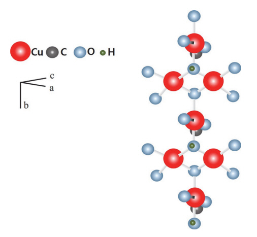 Azurite의 화학구조는 아래 그림 1과 같다[7]. Azurite는 Cu2+이온이 두 개의 O2-와 두 개의 (OH)1-으로 만들어진 평면의 리간드 결합구조가 b축에 평행하게 연결되어 있다. 각 (OH)1-는 3개의 Cu2+에 의해 공유되고 (CO3)2-에 결합된 각각의 O2-는 한 개의 Cu와 결합한 구조이다[8]. 천연 azurite는 구리광산에서도 물이 존재하는 산화환경에서 부식 이차광물로 산출된다[8]. 반면에 합성 azurite는 verditer 혹은 bice라고 불리며, 천연 azurite와 동일한 화학구조를 갖고, 석회나 탄산칼슘에 황산구리나