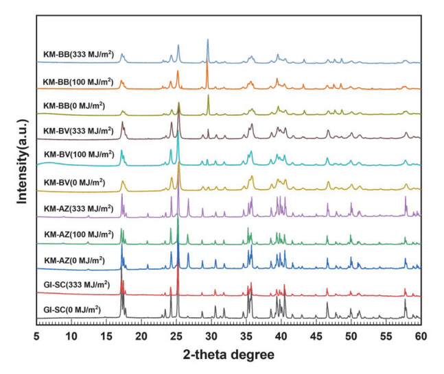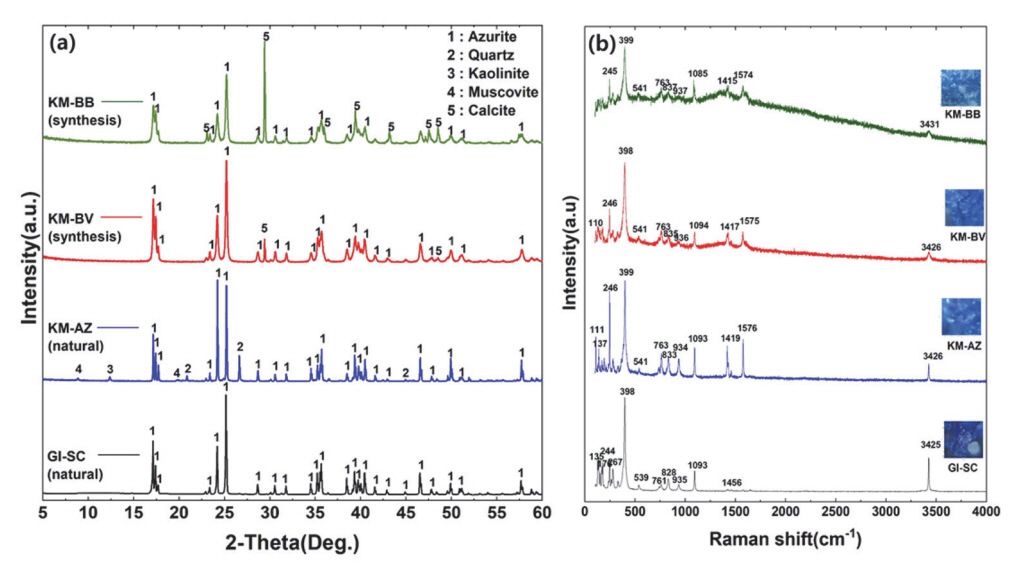 XRD 분석 결과, 천연 azurite인 GI-SC는 azurite 단일 물질이지만 KM-AZ는 azurite외에 quartz(SiO2), kaolinite (Al2Si2O5(OH)4), muscovite(K(OH,F2)2Al3Si3O10)가 미량 분석되었다(그림 2a). 천연 Azurite는 자연에서 산출될 때 원석의 생성 환경에 따라 azurite외에 2차광물이 함께 혼재될 수 있다. 원석을 가공해서 안료를