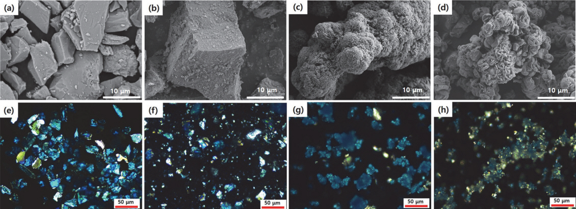 FE-SEM 및 편광현미경으로 각 시료의 입자형태 및 미세조직을 분석하였다(그림 3). 모든 시료는 육안 상으로는 색상 및 입자크기가 유사하지만 입자형태 및 광학특성이 조금씩 다른 것을 볼 수 있다. 천연 azurite인 GI-SC와