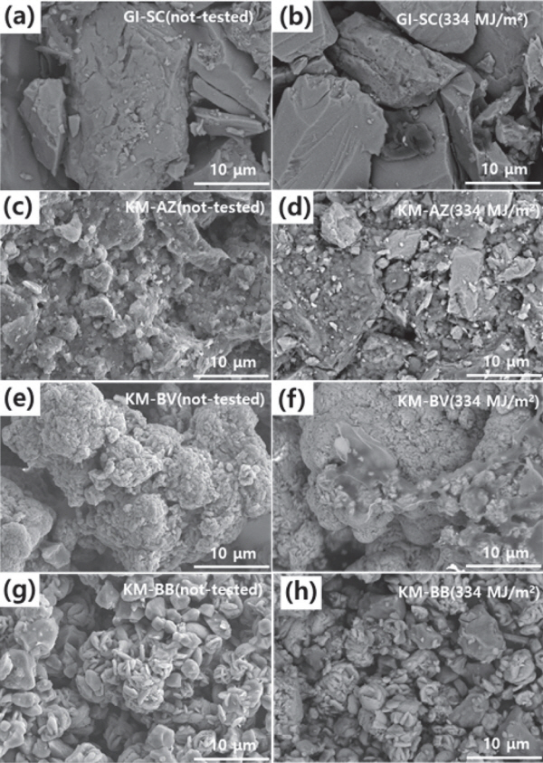 세부 시험조건은 표 2와 같으며, 이를 총 196 cycle 가동하여 안료의 내구성을 평가하였다. 196 cycle 시험하였을 때 누적광량은 334 MJ/m2으로 실제 우리나라 서울 기준 간접광에서 10년, 혹은 직사광에 수평으로 1년간 노출했을 때의 수명으로 예측할 수 있다[14].