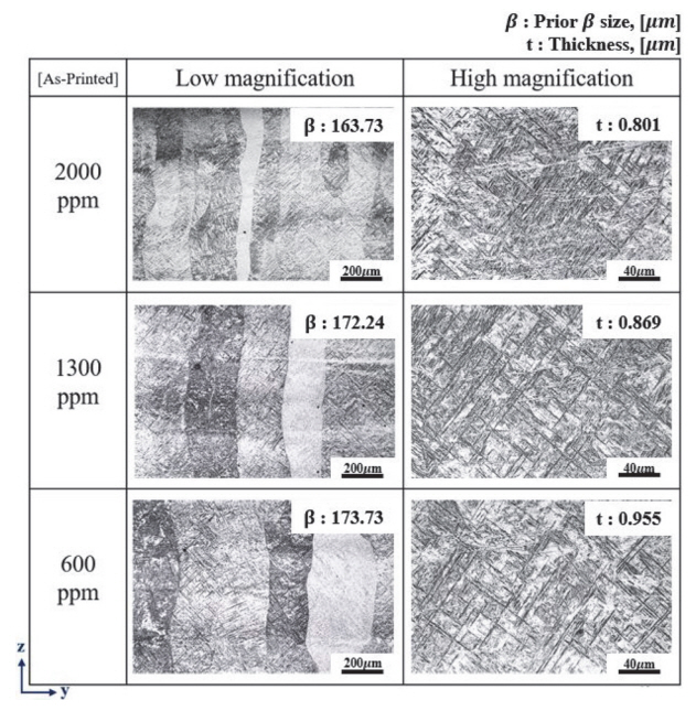 한편, DED 공정을 포함한 전반적인 적층제조 공정으로 타이타늄을 적층 시 β상 변태 온도(beta-trasition temperature, Tβ) 이상에서 용융된 소재가 상온까지 매우 빠른 속도로 응고되는 과정에서 미세한 α’ 마르텐사이트가 형성되는 문제가 있다. 이 조직은 연성에 취약한 층상 형태로 생성되므로 기존 주조 공정에 비해 동일한 강도 대비 급격한 연성 악화를