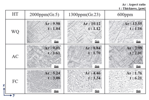 우선 β상이 급냉되면서 α’ 구조로 변태될 때[14], 산소함량이 높을 경우 상대적으로 많은 초석 α상이 lath 성장을 방해하게 된다. 일반적으로 초석 α상의 분율은 α상 분율로 간주해도 무방하기 때문에 산소함량이 높을수록 초석 α상의 분율이 증가하는 것으로 사료된다. 이로 인해 α’ 상이 좁은 공간에서 성장되며 상술한 차이가 발생한다. 또한 냉각속도가 느려질수록 lath의 성장시간이 충분하기에 두께가 점차 증가한다. 노냉 시
