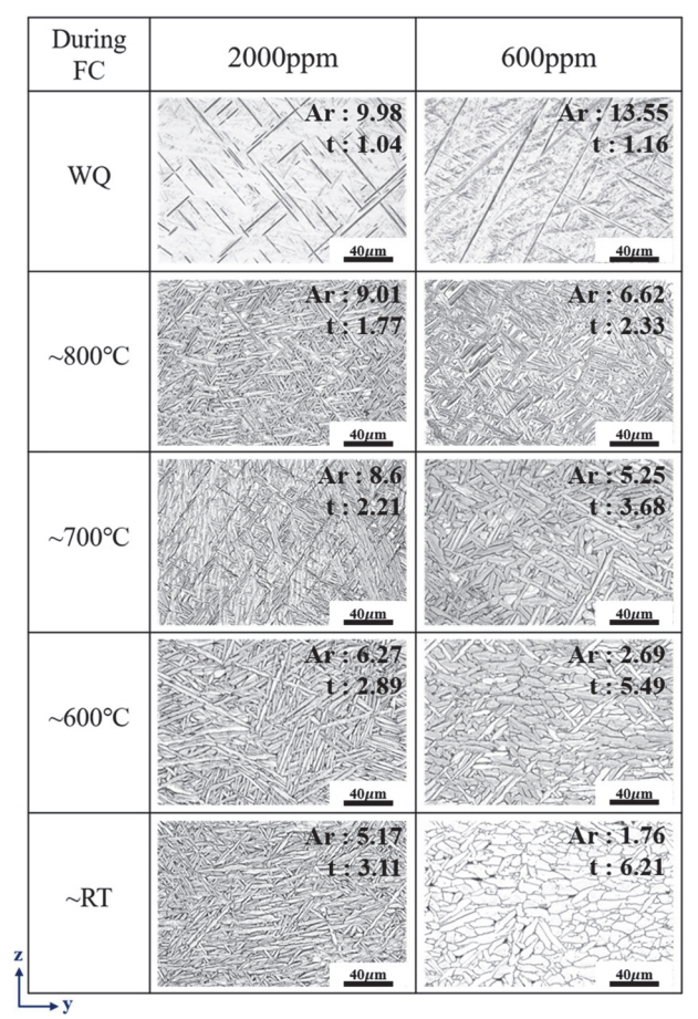 구상화된 조직은 확인되지 않았다. 반면 600 ppm에서는 lath 성장과 노냉이 진행될수록 구상화가 야기되는 것을 미세조직을 통해 확인할 수 있다.