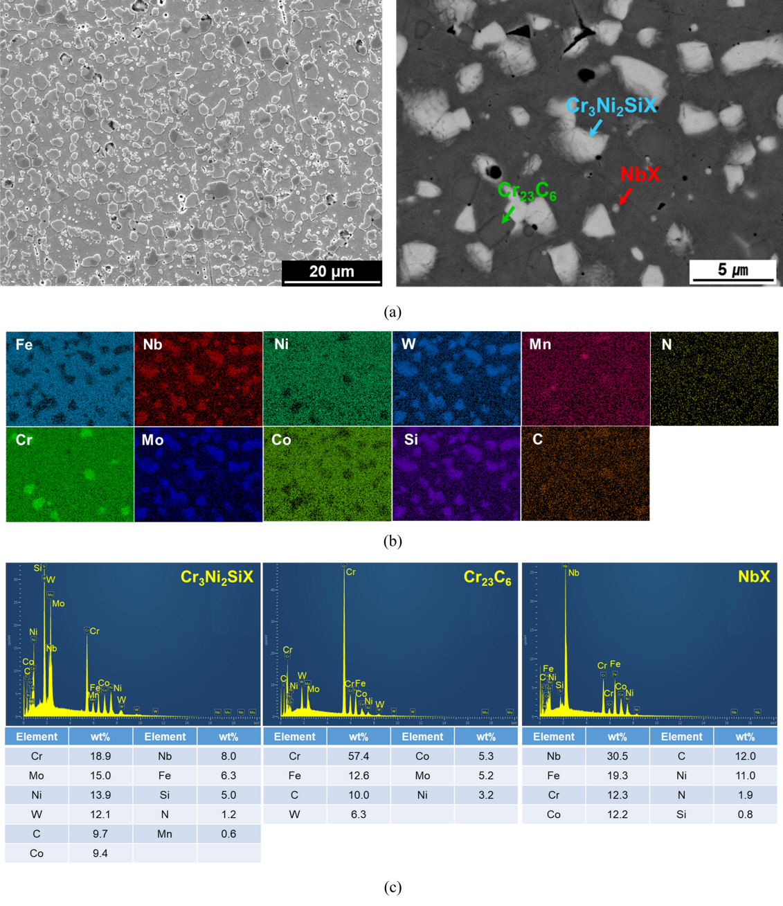 영역은 Nb 함량이 높게 측정되었고 가장자리 영역은 Cr3Ni2SiX 상 구성 원소들의 함량이 높게 측정되었다. 균질화 처리된 미세조직 분석을 통해 열적 안정성이 높은 NbX는 균질화 처리 과정에서 용해되지 않고