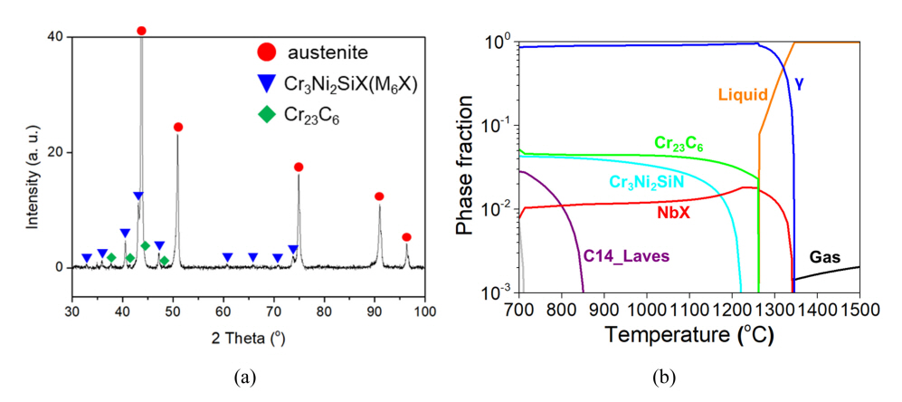 특히 해당 carbonitride는 Si 함량이 높은 특징을 가지고 있다. 그림 2(a)은 소결체의 XRD 분석 결과를 나타내었으며, 기지(matrix) 조직인 오스테나이트 외 M6X와 Cr23C6 peak이 관찰되었다. 내열강에서 드물지만 M6X의 M site에 Si이 포함된 상이 관찰된다[2,3]. 이들을 M5SiX 혹은 Cr3Ni2SiX 상으로 표현하며 다양한 합금 원소와 함께 비교적 넓은 조성 범위를 가지는 특징이 있다 [4-6]. 따라서, 주요 석출 상으로 나타난 carbonitride는 Cr3Ni2SiX 상으로 추측된다. 그림 2(b)는 Thermo-Calc 소프트웨어로 계산된 온도에 따른 상 분율을 나타낸 그래프이다. 열역학 계산 결과 소결 온도인 1165°C에서 Cr23C6, Cr3Ni2SiN, NbX 상이 나타난다. TCFE11 데이터베이스에서는 Cr3Ni2SiN nitride에 대해서만 모델링이 되어 있기 때문에 Cr3Ni2SiX carbonitride를 제대로 재현하지 못한다. 따라서, Cr3Ni2SiX 상에 대해 정확한 계산이 어려우며 이로 인해 실험 결과와는 다르게 소결 온도에서 주요 석출 상이 Cr23C6로 계산된다. 열역학 계산 결과와 미세조직 분석 결과 NbX 상 역시 관찰되며 낮은 분율로 인해 XRD 분석 결과에 peak이 나타나지 않은 것으로