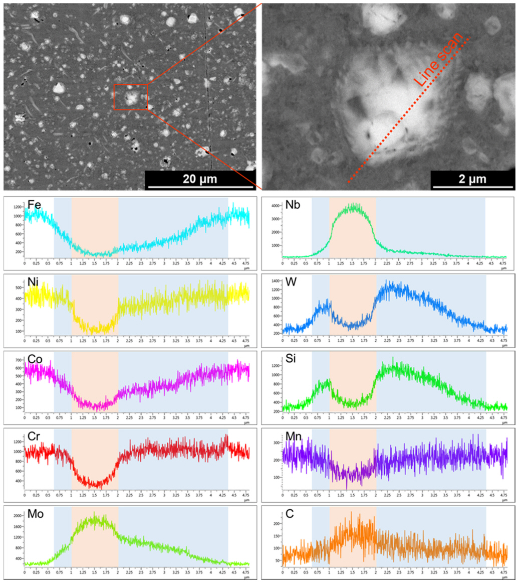 구성 원소를 단거리 확산을 통해 제공 받을 수 있는 이점 역시 존재한다 [12]. 따라서, 균질화 처리 후 남아있던 NbX가 Cr3Ni2SiX의 핵 생성 site를 제공하며, 해당 site에 Cr3Ni2SiX가 형성되면서 조성이 두 영역으로 구분되는 석출물이 형성된 것으로 예상된다.